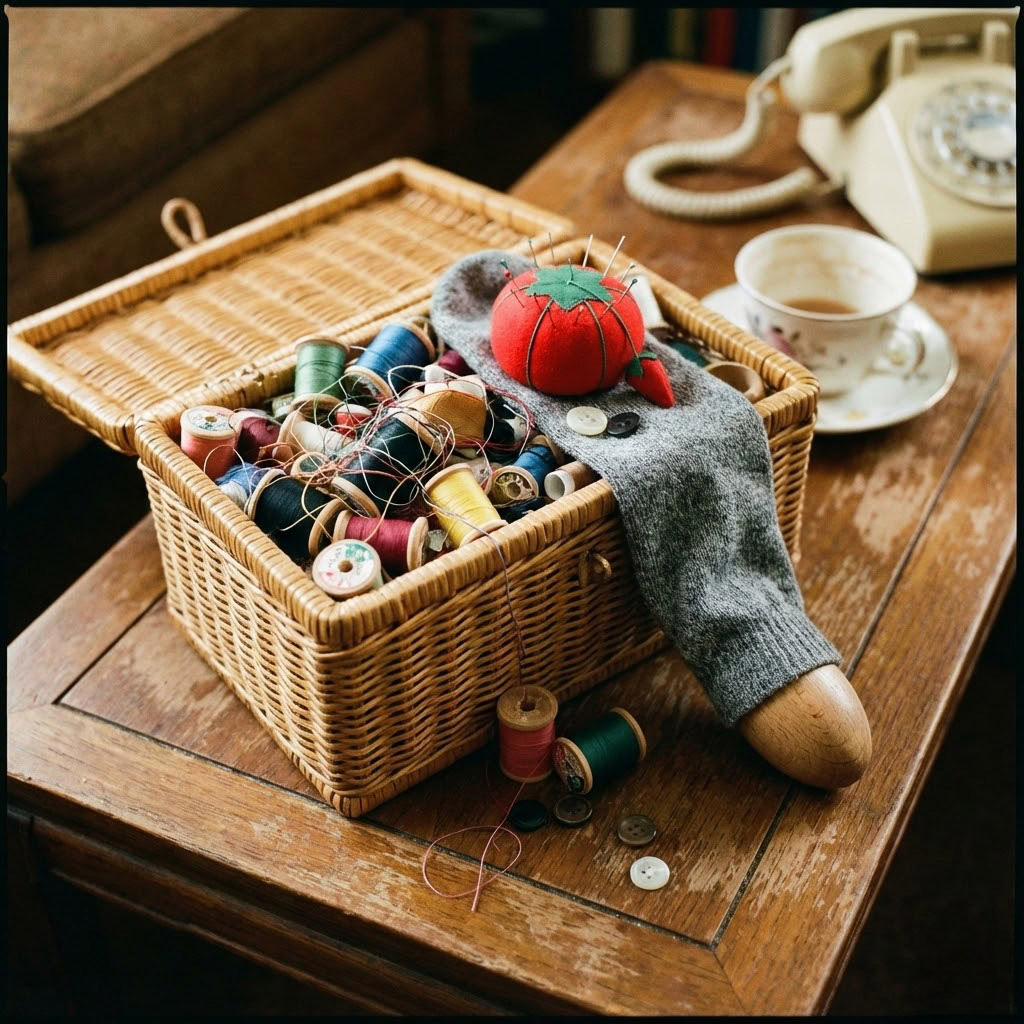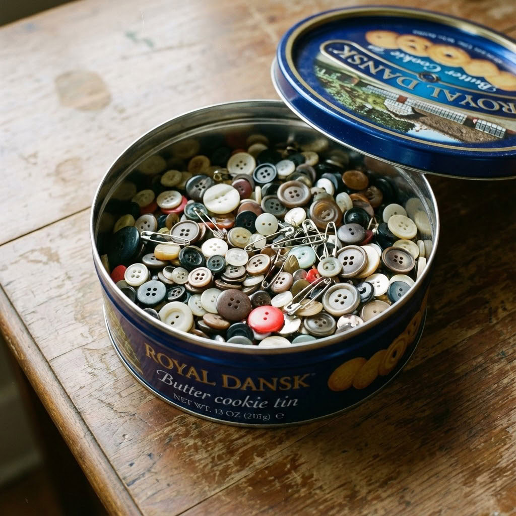 Before a shirt became a rag, the buttons and zipper were cut off. Repairs came from the tin, not the store.