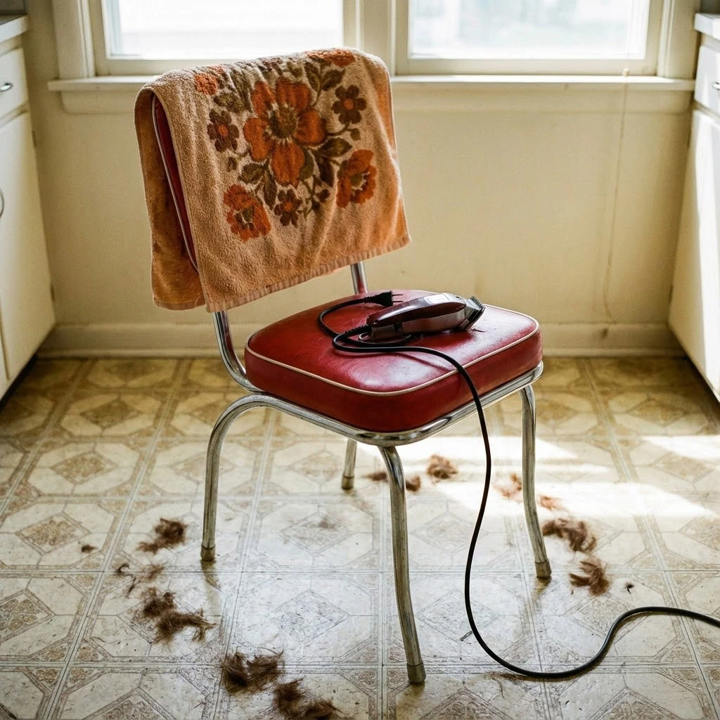 Haircuts happened in the kitchen on a Saturday morning, not at a salon.